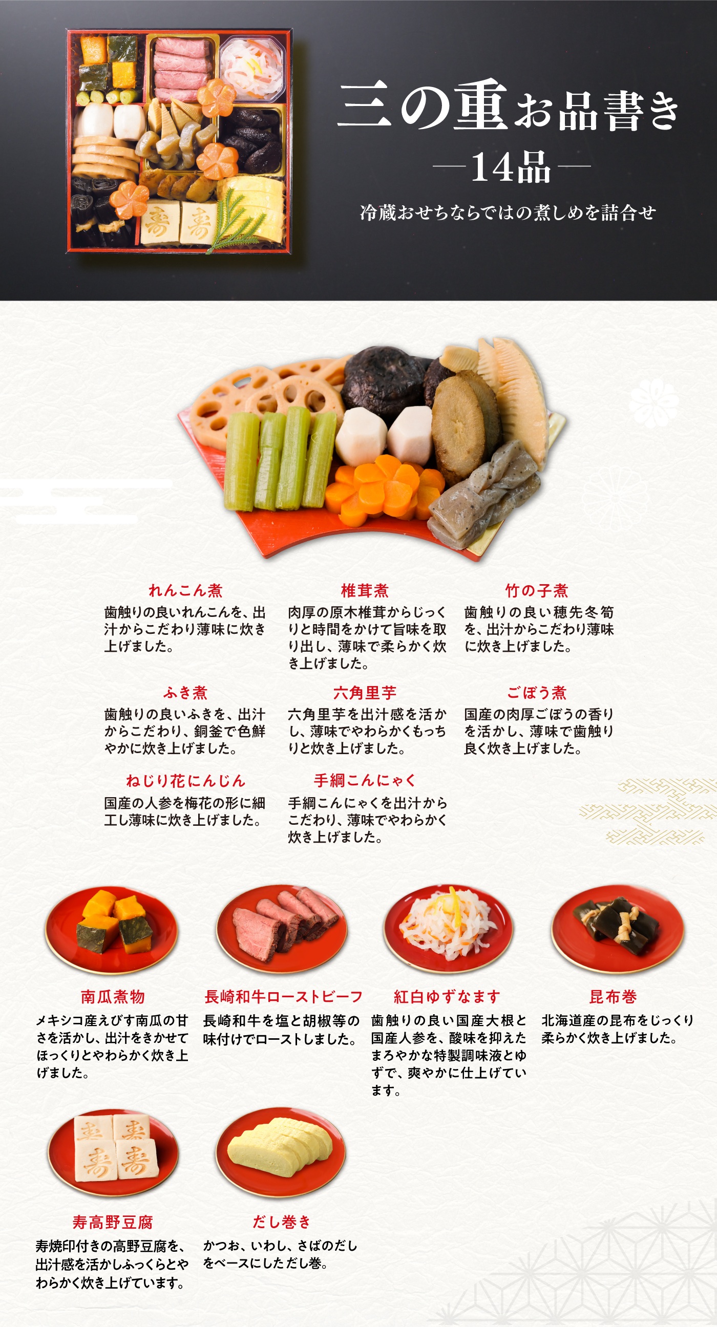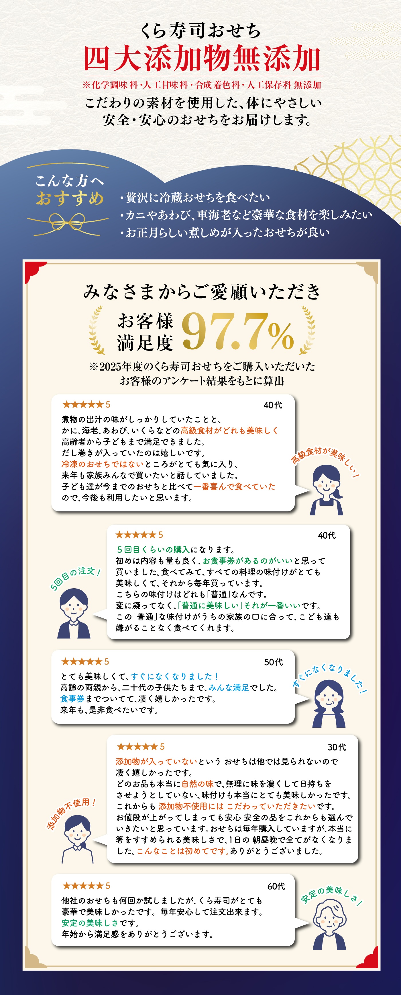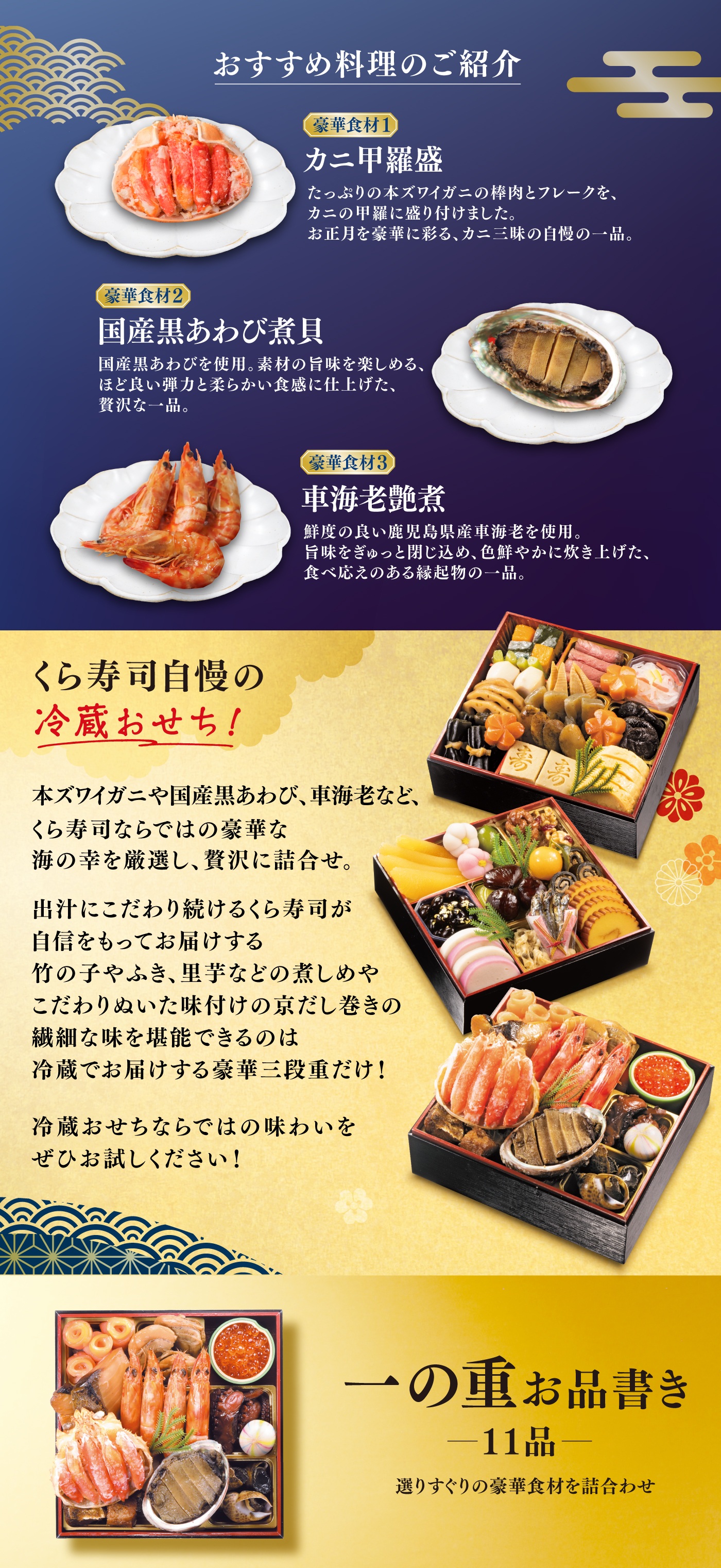 くら寿司ネット通販「無添加工房」くら寿司おせち 【予約】2026 くら寿司特製おせち 豪華三段重 食事券3,000円分 4人前 41品 6.5寸 盛付済 (冷蔵で12/31お届け、時間指定不可) 当店通常価格: ¥29,800(税込) 価格: ¥29,800 (税込) [ポイント還元 298ポイント~] 販売期間: 2025年09月01日09時00分~2025年12月23日23時59分 数量: セット 在庫 × 返品についての詳細はこちら 5.0 (1件) 【予約】2026 くら寿司特製おせち 豪華三段重 食事券3,000円分 4人前 41品 6.5寸 盛付済 (冷蔵で12/31お届け、時間指定不可) 当店通常価格: ¥29,800(税込) 価格: ¥29,800 (税込) [ポイント還元 298ポイント~] 販売期間: 2025年09月01日09時00分~2025年12月23日23時59分 数量: セット 在庫 × 返品についての詳細はこちら 5.0 (1件) お客様の声 資源有効利用堂様 投稿日:2024年12月31日 おすすめ度: 大晦日のこの時点では今年のくら寿司のお節はまだ口にはしていません。明日元旦に家族一家でいただくのが愉しみです。その上で、毎年添加物、殊に化学調味料が入っていない、冷凍ではない絶佳のおせちを一家で堪能できるのは何より恵みです!